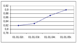 Как видно из табл. 2.5, значение коэффициента на протяжении рассматриваемого периода стремиться к 1 (от 0,82 до 0,90), следовательно, качество кредитного портфеля высокое с точки зрения возвратности. Динамика изменения этого коэффициента изображена на рис.2.7