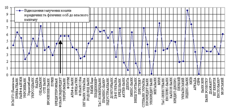 Як показують результати аналізу, наведені на графіках рис. 2.5 БАНК “Фінанси та Кредит” станом на 01.04.2007 року займає 9-те місце в банківській системі України по обсягам залучених коштів юридичних та фізичих осіб, при цьому ці обсяги в 5 разів менші, ніж у лідера БС України – АКБ “Приватбанк”.