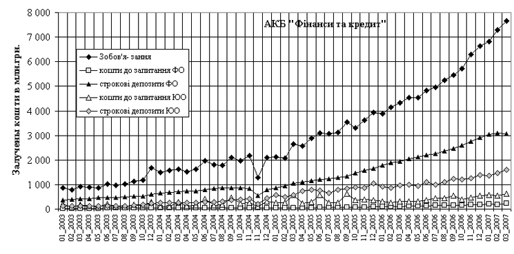 Як показує аналіз графіків рис.2.3 – 2.7 результати структурного аналізу часток залучених коштів та власного капіталу в БАНК “Фінанси та Кредит” у 2003 – 2007 роках свідчать про наступну політику формування залучених коштів менеджментом банку: