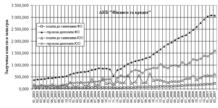 Динаміка обсягів та структури залучених коштів в БАНК “Фінанси та кредит” у 2003 –2007 роках характеризується графіками, наведеними на рис.2.1 – 2.2. Як показує аналіз наведених графіків, темп зростання залучених коштів фізичних та юридичних осіб в БАНК “Фінанси та Кредит” за 2005 – 2007 роки характеризується: