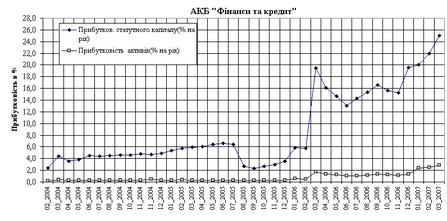 Рис.2.1. – Динаміка прибутковості статутного капіталу та активів в БАНК “Фінанси та кредит” за 2004 – 2007 роки