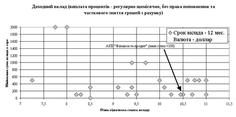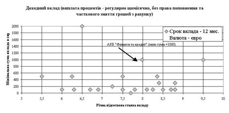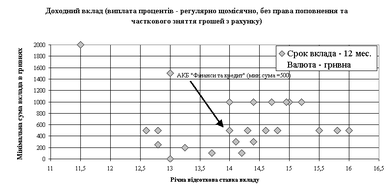 Рис.2.15. – Конкурентне позиціонування пропозицій БАНК “Фінанси@К” в сегменті доходних строкових депозитів фізичних осіб в гривнях (обмеження мінімальної суми депозиту в залежності від % ставка депозиту)