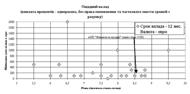 Рис.2.19. – Конкурентне позиціонування пропозицій БАНК “Фінанси@К” в сегменті доходних строкових депозитів фізичних осіб євро (обмеження мінімальної суми депозиту в залежності від % ставка депозиту)