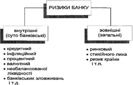 На зовнішні та внутрішні банківські ризики поділяються з погляду сфер виникнення та можливостей управління ними. Така класифікація показана на рис. 1.1.