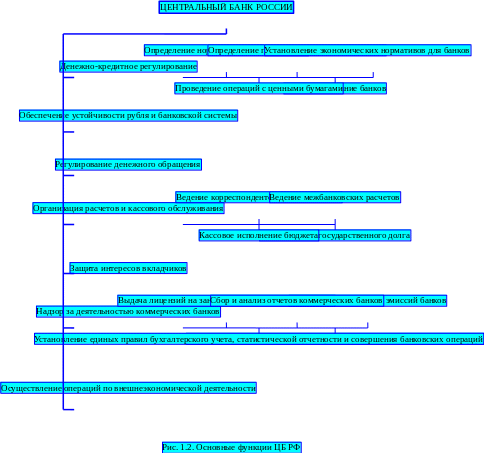 Центральный банк Российской Федерации (ЦБ РФ), являясь главным звеном банковской системы России, наделен правом денежно-кредитного регулирования, эмиссии денег, регулирования валютного курса, хранения золотовалютных резервов страны и надзора за коммерческими банками. Основные функции ЦБ РФ представлены на рис. 1.2.