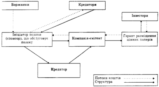 На схемі рис.3.3 показано можливий процес сек'юритизації на українському фінансовому ринку, який базується на структурі і грошових потоках, породжених необхідними зобов'язаннями під активи.