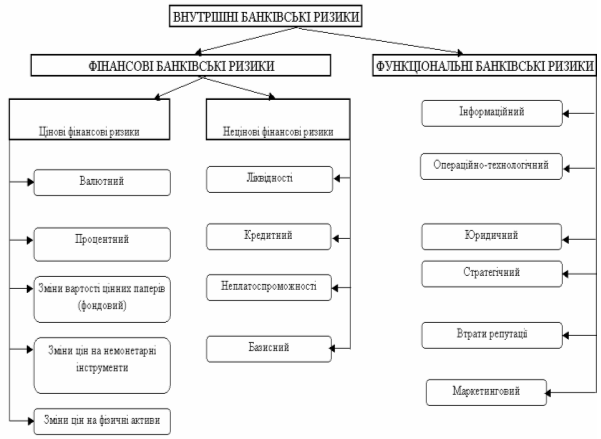Рис.1.1. Фінансово-функціональний розподіл внутрішніх банківських ризиків [69]