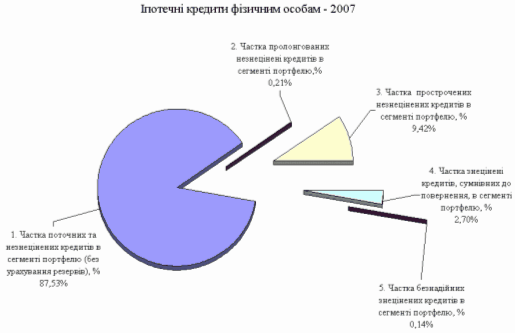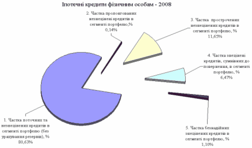 - обсяг поточних та незнецінених іпотечних кредитів фізособам зріс з рівня 2,581 млрд.грн. (01.01.2008) до рівня 3,222 млрд.грн. (01.01.2009), тобто практично в 1,3 рази, при цьому частка поточних та незнецінених іпотечних кредитів в сегменті портфелю (без урахування резервів) зменшилась з рівня 87,5% станом на 01.01.2008 до рівня 80,6% станом на 01.01.2009;