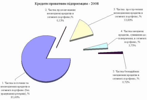 - обсяг прострочених незнецінені кредитів фізособам –приватним підприємцям зріс з рівня 110,7 млн.грн. (01.01.2008) до рівня 634,8 млн.грн. (01.01.2009), тобто практично в 5,8 раза, при цьому частка прострочених незнецінених кредитів в сегменті портфелю (без урахування резервів) зросла з рівня 5,19% станом на 01.01.2008 до рівня 13,8% станом на 01.01.2009;