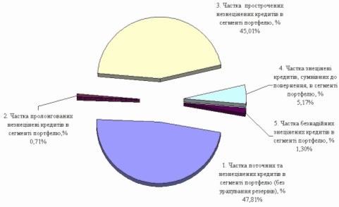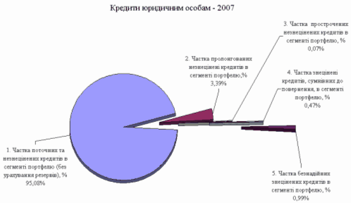 - обсяг пролонгованих незнецінені кредитів юридичним особам зріс з рівня 0,81 млрд.грн. (01.01.2008) до рівня 1,98 млрд.грн. (01.01.2009), тобто практично в 2,4 рази, при цьому частка пролонгованих незнецінені кредитів в сегменті портфелю (без урахування резервів) зросла з рівня 3,39% станом на 01.01.2008 до рівня 4,15% станом на 01.01.2009;