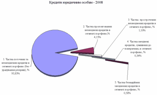 - обсяг поточних та незнецінених кредитів юридичним особам зріс з рівня 22,7 млрд.грн. (01.01.2008) до рівня 44,8 млрд.грн. (01.01.2009), тобто практично в 2 рази, при цьому частка поточних та незнецінених кредитів в сегменті портфелю (без урахування резервів) зменшилась з рівня 95,1% станом на 01.01.2008 до рівня 93,8% станом на 01.01.2009;