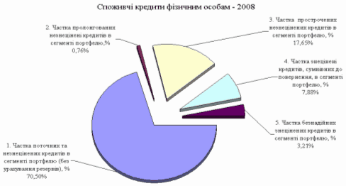 - обсяг поточних та незнецінених споживчих кредитів фізособам зріс з рівня 6,531 млрд.грн. (01.01.2008) до рівня 12,754 млрд.грн. (01.01.2009), тобто практично в 1,9 рази, при цьому частка поточних та незнецінених споживчих кредитів в сегменті портфелю (без урахування резервів) зросла з рівня 47,8% станом на 01.01.2008 до рівня 70,5% станом на 01.01.2009;