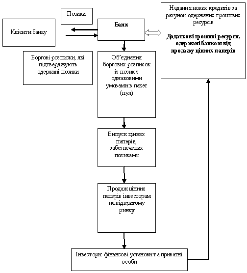 Одним з механізмів інвестиційного кредитування клієнта, що зменшує ризик ліквідності банків та необхідності формування значних резервів на кредитні ризики, є використання сек’юритизації позик та інших активів. Цей механізм, як процес трансформації неліквідних активів на ліквідні цінні папери, відображений схематично на рис.3.2.