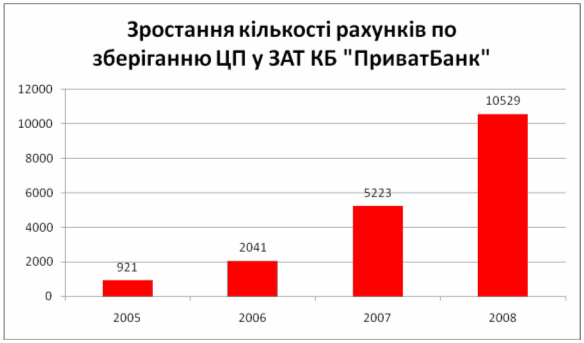 Рис 2.7.2. Зростання кількості рахунків по зберіганню ЦП у ЗАТ КБ «ПриватБанк»