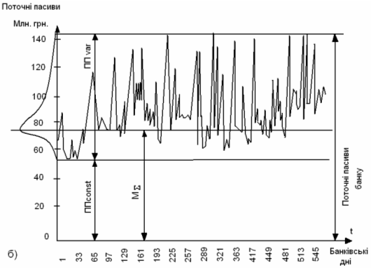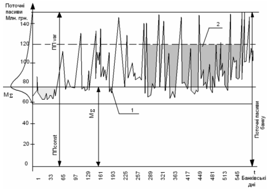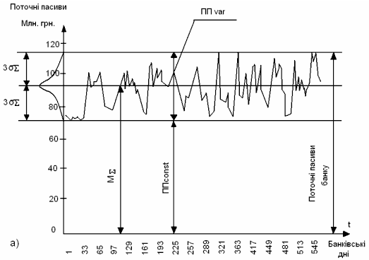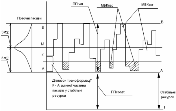 При нормальному розподілі величина “пульсуючих” пасивів визначається межами діапазону розсіювання (ППvаr = 2 * 3, де - середньо квадратичне відхилення). Стабілізація доцільна до середнього рівня, чи рівня математичного очікування М , і визначається також співвідношенням величин ставок за активами та пасивами. Виграш у тому, що “довгі” ресурси створюються за рахунок дешевих “пульсуючих” поточних пасивів додатково блокованих дешевими короткостроковими запозиченнями на міжбанківському ринку.