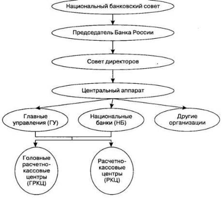 Структура Банка России включает: Национальный банковский совет, председателя Банка России, совет директоров, центральный аппарат, территориальные учреждения, расчетно-кассовые центры (РКЦ), другие организации, включая вычислительные центры, полевые учреждения, учебные заведения.