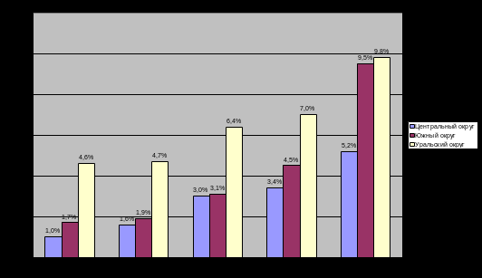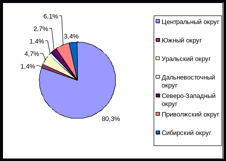 Региональная структура потребительского кредитования, как и кредитование реального сектора, характеризуется крайней неравномерностью (см. рис. 2). Так, более 80% выданных кредитов приходятся на Центральный округ. Причем из них 97% приходится на Москву. Наименьшим объемом кредитных ресурсов обладают жители Дальневосточного округа (1,4%) и Южного округа (1,4%).
