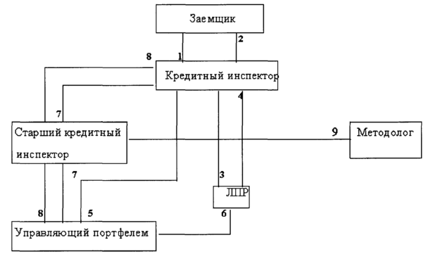 Непосредственное взаимодействие банка с заемщиком обеспечивается в процессе выполнения служебных обязанностей группой сотрудников кредитного подразделения, представителя которой мы условно обозначаем кредитный инспектор. Взаимодействие заемщика и кредитного инспектора носит характер двустороннего информационного обмена, обозначенного на схеме стрелками 1 и 2. Кредитный инспектор получает от заемщика информацию о параметрах предполагаемой кредитной сделки, данные необходимые для оценки кредитного риска данного заемщика, данные мониторинга финансового состояния и показателей деловой активности, необходимые для оценки изменения кредитного риска заемщика в период до истечения срока сделки. Также кредитный инспектор получает информацию о выполнении либо не выполнении заемщиком условий кредитной сделки, перспектив возврата предоставленных кредитных ресурсов и уплаты процентов. С другой стороны, заемщик информируется кредитным инспектором об условиях кредитования, принятом банком решении о предоставлении/отказе в предоставлении кредита. Взаимодействие кредитного инспектора с лицом, принимающим решение (ЛПР - должностное лицо, кредитный совет, или какой-либо орган в системе управления банком, в компетенцию которого входит принятие решения о выдаче/отказе в выдаче кредита, изменении условий кредитного соглашения, санкционирование применения мер воздействия на заемщика, нарушившего условия кредитного соглашения и т.п.) основано на предоставлении кредитным инспектором информации, необходимой для принятия того или иного решения в рамках кредитных операций, и доведении до сведения кредитного инспектора принятого решения. Принятие ЛПР решения означает для кредитного инспектора руководство к действию. Кредитный инспектор информирует ЛПР об условиях кредитной сделки, доводит до его сведения результат проведенной оценки кредитного риска данного потенциального заемщика, а также предоставляет сведения об изменении оценки кредитного риска заемщика в период между выдачей кредита и сроком завершения кредитной операции (стрелка 3 на схеме). Кредитный инспектор предоставляет ЛПР сведения о выполнении заемщиком условий кредитного соглашения, либо невозврате кредита. ЛПР предоставляет руководство к исполнению по каждому факту его информирования со стороны кредитного инспектора (стрелка 4 на схеме).