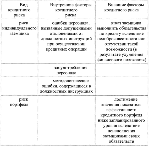 | Кредитный риск | Снижение кредитоспособности заемщика Ухудшение качества кредитного портфеля Возникновение просроченного основного долга и процентных платежей Появление проблемных ссуд Возникновение факторов делового риска Ненадежность источников погашения долга |