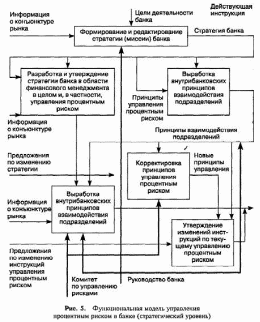 Теперь рассмотрим сам процесс оперативного управления. Как наглядно представлено на схеме, при его построении должны учитываться как ряд общих принципов построения системы управления, так и специфика управления процентным риском. Указанные положения нашли свое отражение в следующем. С одной стороны, принятие управленческих решений осуществляется в виде определенной последовательности (оценка условий, анализ исходной информации, принятие адекватных решений). С другой стороны, в схеме принятия решений присутствует такой элемент, как обобщение результатов анализа процентного риска с информацией о других параметрах финансовой деятельности банка, и лишь затем выносится управленческое решение. Процентный риск тесно связан с другими видами риска, с которыми сталкивается коммерческий банк в процессе своей деятельности. Учитывая это, становится очевидным, что решения по управлению процентным риском следует принимать с учетом влияния всех остальных финансовых показателей банка.
