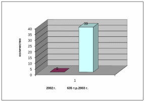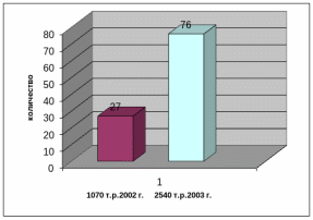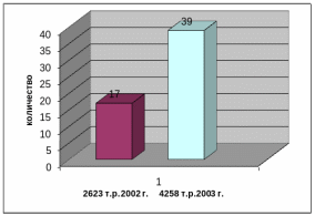 Анализируя диаграмму на рис. 2.13. можно сказать, что в 2003 году предоставлено под залог иностранной валюты на 22 кредита больше, по сравнению с 2002 годом. А если смотреть по сумме выданных кредитов, то она на 62% превышает сумму 2002 года.