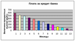 Плата за кредит (проценты) составит 3686,3 рублей. Цена кредита зависит от величины задолженности и составит в первые месяцы чуть более 500 рублей, а в последующие будет снижаться до 50 рублей в месяц (рис. 2.11).