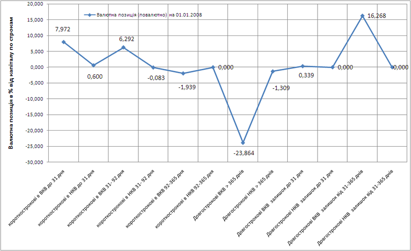 | Сумарна валютна позиція в %(повалютно) станом на 01.01.2008 | 1,590 | 2,339 | 1,014 | 0,096 | 1,860 |