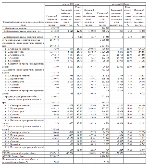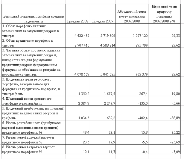 - балансовий обсяг ресурсного(депозитного) портфелю банку у 2009 році відносно рівня 2008 року зріс на + 29,3%, а балансовий обсяг кредитного портфелю у 2009 році відносно рівня 2008 року зріс тільки на + 23,6%;