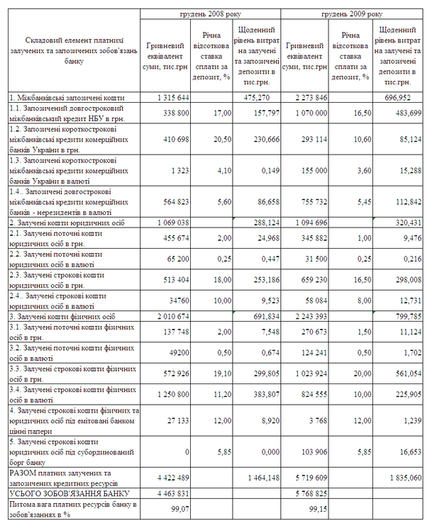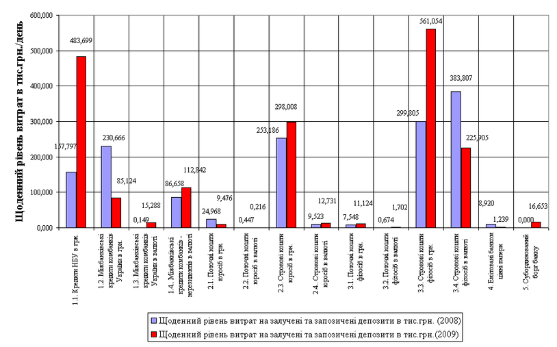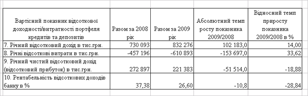- обсяг щоденних відсоткових витрат відповідного депозитного портфелю банку з рівня 1,350 млн.грн./день у 2008 році (грудень) зріс до рівня 1,617 млн. грн./ день у 2009 році (грудень), тобто зростання склало +19,8%;