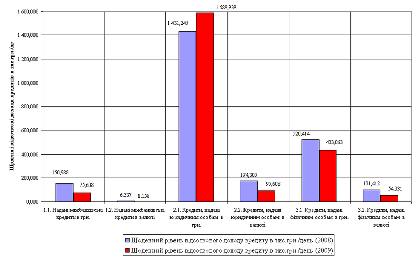 - відповідно обсяг щоденного прибутку від експлуатації кредитного порт-фелю банку з рівня 1,035 млн.грн./день у 2008 році (грудень) зменшився до рів-ня 0,632 млн. грн./ день у 2009 році (грудень), тобто падіння склало -38,9%.