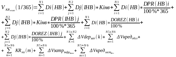 1) Щоденну вартість витратного кредитного портфеля з приведенням коштів в операціях з іноземною валютою до гривневого еквіваленту (по поточному курсу іноземної валюти до національної валюти) можна представити у вигляді наступного рівняння (V_KR_PORT(1/365)):