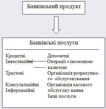 Специфіка функціонування банківських установ полягає в тому, що їхнім продуктом є надання різноманітних послуг шляхом проведення активних, пасивних і комісійно-посередницьких операцій з метою задоволення якоїсь потреби (схема 1). Тому серцевину продукту, його сутність складає спрямованість на розв'язання певної проблеми.