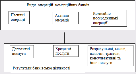 Пасивні операції полягають у залученні тимчасово вільних грошових коштів для формування своїх ресурсів. При проведенні активних операцій банки розміщують сформовані ними ресурси з метою отримання прибутку. Комісійно-посередницькі операції проводяться банком за дорученням і на користь клієнта за певну плату. Щодо останніх, то йдеться, власне, не про формування і розміщення ресурсів, а про переміщення вже наявних у банку коштів клієнта за його розпорядженням або про проведення інших операцій, безпосередньо не пов'язаних із рухом грошей (про так звані позабалансові послуги).