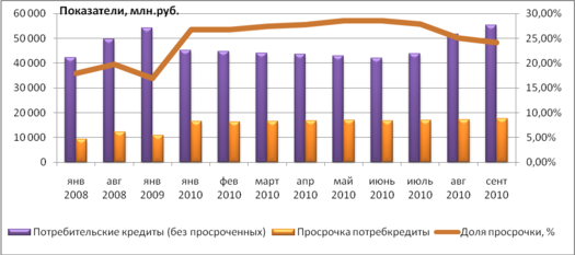 Объем выдачи потребительских кредитов с начала 2010 года увеличился на 22,6%, а доля просрочки по ним уменьшилась на 6,7%.
