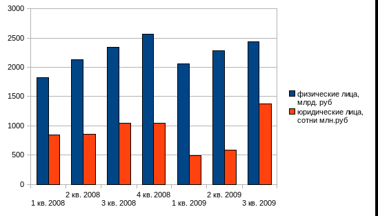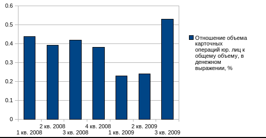 Так, при общем росте объема платежей физических лиц, совершаемых банковскими картами, составившему в третьем квартале 2009 года 133% против этого же показателя в первом квартале 2008 года, отсутствует поступательный рост этого показателя, что обуславливается и сказывающимся влиянием сезонности, и общей нестабильностью российской экономики в 2009 году и второй половине 2008-го. Так, некоторые банки, специализировавшиеся на потребительском кредитовании физических лиц и обеспечивавшие значительную долю в общей эмиссии карт и платежном обороте с их использованием, не только снизили темпы роста эмиссии, но и допустили значительное падение числа находящихся в их обороте пластиковых карт, что связано с падением спроса на их услуги в условиях упавшей платежеспособности серьезной части трудоспособного населения. Таким образом, существенная часть потенциальных клиентов, перестала отвечать требованиям банка, что незамедлительно не лучшим образом сказалось как на состоянии самих банков, так и на рынке карточных платежных систем.