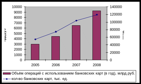 Несмотря на достаточно высокие темпы прироста количества банковских карт и объема операций, совершаемых с использованием платежных карт (в 2008 г. они составили 15,2 и 41,6 % соответственно).