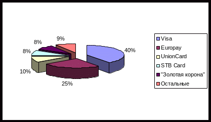 Наибольшей популярностью среди пользователей пластиковых карт в Российской Федерации пользуются международные пластиковые карты ViSa (40%) и Europay (25%), которые принимаются по всему миру в более чем 120 странах мира (см. рис. 2).