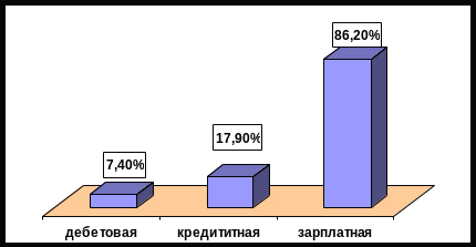 Среди держателей карточек подавляющее большинство составляют держатели расчетных (дебетовых) карточек. Их доля в общем количестве эмитированных карточек составляет 90,9%. При этом количество карточек, полученных держателями по собственной инициативе, по-прежнему незначительно, т. е. подавляющее большинство карточек - это карточки, выданные кредитными организациями в рамках «зарплатных» проектов.