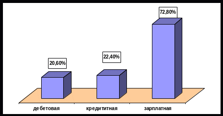 В Москве картина несколько иная: 51,8% участников опроса пользуются банковской пластиковой карточкой; 28,6% не пользуются, но предполагают это сделать. Интересно, что доля держателей мужчин и женщин также одинакова. К наиболее активным держателям (60,4%) относятся люди в возрасте от 18 до 35 лет. 57% пользователей имеют высшее образование. 57,2% опрошенных имеют ежемесячный доход от 10 до 30 тыс. руб. в месяц. В ходе опроса выяснилось, что 66,6% участников имеют только одну пластиковую карточку, 20% — две пластиковые карточки, остальные — три карточки и более. На вопрос, какой именно карточкой вы располагаете, ответы были таковы: зарплатной — 72,6% опрошенных, кредитными — 22,4% (рис.8).