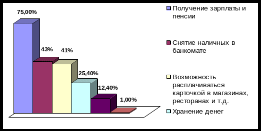 Что касается целевого использования пластиковых карточек, то очень низкий процент опрошенных — 12,4% — указали, что используют их для получения денег в кредит. В Москве 22,4% опрошенных сообщили, что имеют кредитные карточки, однако используют их для получения кредита только 12,4%. И такая проблема реально существует: банки тратят деньги на эмиссию пластиковых карточек, но при этом не все их клиенты используют свои карточки для получения кредитов. Наиболее востребованные услуги: 76% — для получения зарплаты и пенсии, 43% — для снятия наличных в банкомате (рис.10).