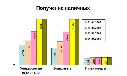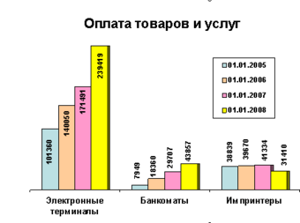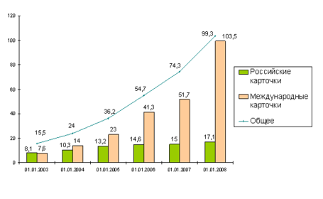 Проанализировав эти данные, можно сделать вывод о том, что за период с 2001г. по 2008г. общая эмиссия банковских карточек в стране выросла с 10,5 до 103,5 млн. (рис. 6), т. е. почти в 10 раз!
