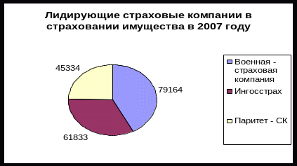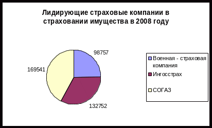 Из вышеприведенных данных о лидерах страховых копаний в страховании имущества видно, что лидер в 2008 году изменился по сравнению с предыдущим годом. Военная - страховая компания в страховании имущества по сравнению с 2007 годом занимает лишь третье место в 2008 году соответственно.