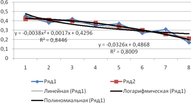 Тенденция снижения величины риска в изучаемом периоде отчетливо проявляется в результате построения выровненной параболы по данным рассчитанным методом наименьших квадратов: