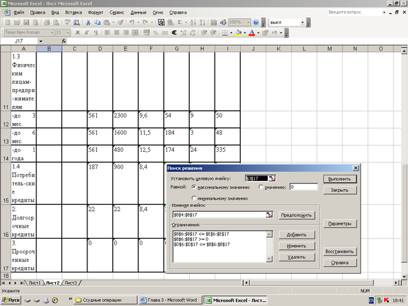 В графу "Лимиты" в качестве исходных данных введем значения максимально и минимально допустимых объемов размещения ресурсов по отдельным группам кредитов. Максимально допустимые объемы размещения кредитных ресурсов определяются исходя из границ локальных рынков на которых оперирует банк, ограничений, выдвигаемых Правлением ОАО "Социнвестбанк", а также из соображений диверсификации портфеля. Кроме того, здесь учитывается специализация банка. Специализацией Иглинского допофиса является преимущественное (свыше 80%) краткосрочное кредитование юридических лиц, потребительские же кредиты выдаются только своим работникам.