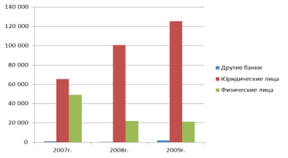 Приведенные в таблице 4 данные показывают, что доля услуг по кредитованию других банков увеличилась в 2009 году на 28,2% и 20,5 в сравнении с 2007 и 2008 годами. В 2009 году снизился удельный вес услуг по кредитованию физических лиц на 66,1% и 19,8% к уровню 2007 и 2008 годов. Доля услуг по кредитованию юридических лиц увеличились в 2009 году на 49,0% и 3,3% по сравнению с 2007 и с 2008 годами.