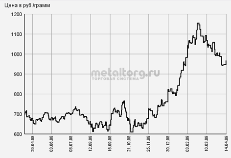 | Платина (Сбербанк России, рубль/грамм) | 1288 | 1360 | 14.04.2009 09:30 | +24 |