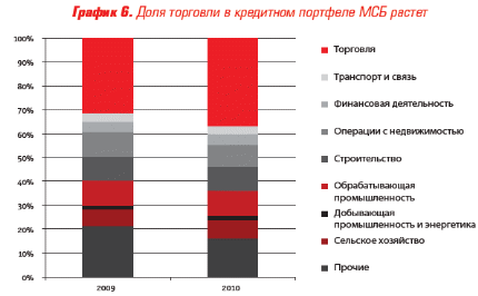При этом суммарно во 2 полугодии 2010 года банками будет предоставлено кредитов МСБ в районе 2,3–2,4 трлн. рублей, что на 15–17% больше результатов 1 полугодия. В 2011 году ожидается продолжение роста рынка. И хотя взрывного роста рынка, характерного для 2006–2008 годов, продемонстрировано не будет, динамика сохранится положительная, обеспечивая рост на уровне не менее 20–30%.