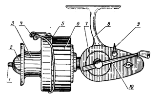 Сверху шпули находится выполненный в виде фигурной гайки регулятор фрикционного тормоза, крепящий шпулю коси катушки. Роль этого тормоза очень важна и сводится в основном предотвращению обрыва лески при сильных рывках крупной рыбы. Регулятор тормоза поворачивается до такого уровня при котором усилие, необходимое для прокручивания шпули против хода часовой стрелки, будет несколько меньше разрывного усилия лески. При срабатывании тормоза включается трещотка, подающая сигнал о поклевке рыбы. Использование тормоза целесообразно, если нужно напустить леску- под нагрузкой рыба быстрее утомляется и вероятность резких ее движений уменьшается, что тоже способствует сохранности лески и катушки.