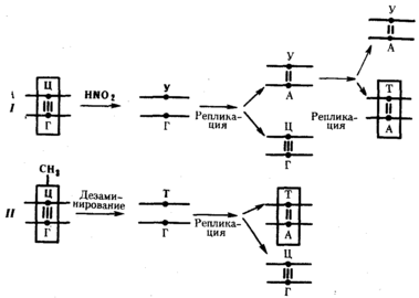 Из приведенных примеров видно, что изменения структуры молекулы ДНК по типу замены оснований возникают либо до, либо в процессе репликации первоначально в одной полинуклеотидной цепи. Если такие изменения не исправляются в ходе репарации, то при последующей репликации они становятся достоянием обеих цепей ДНК.