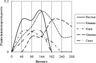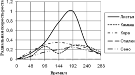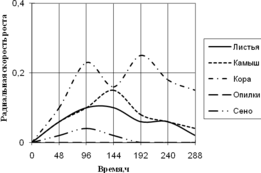 Радиальная скорость роста A. flavus на протяжении всей экспозиции значительно не изменялась. Максимальная скорость роста на среде с сеном приходится на 96 ч., на средах с листьями, камышом и корой – на 192 ч. времени культивирования. Также как и A. fumigatus, A. flavus не использует опилки в качестве единственного источника углерода. На средах с листьями и сеном вид растет с 2-суточной периодичностью. Биоритмы большей продолжительности (3,5–4-х суток) наблюдаются на средах с камышом и корой.